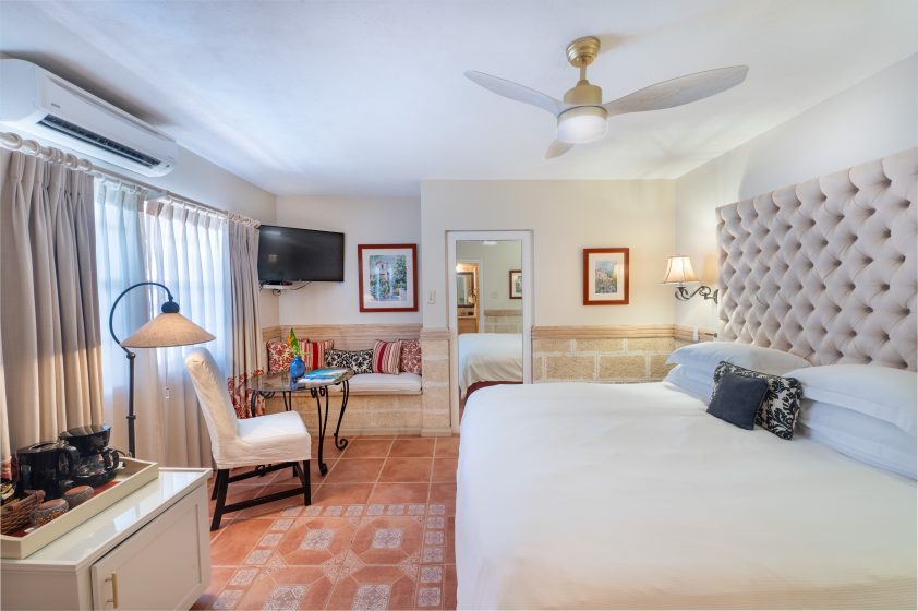 A king bedded room with cozy appeal, equipped with sitting area, bathroom with walk-in shower and coral stone vanity with hand-made pottery basin. Formerly, our Garden Standard Room, this room has been enhanced in 2023 with a deck and sitting pool for the exclusive use of guests of this room located across the corridor and in the garden area.